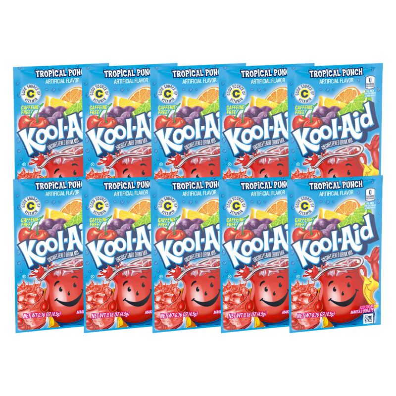 Quench your thirst with the refreshing taste of Kool Aid Unsweetened Tropical Punch Artificially Flavored Powdered Drink Mix. Unsweetened powdered drink mix makes it easy to prepare a fruity tropical punch drink anywhere. Our artificially flavored tropical punch powder drink mix is caffeine free, a good source of vitamin C and a great choice for the whole family. Each handy packet of unsweetened tropical punch drink mix ensures that you always have a refreshing beverage ready to go. To prepare, empty the contents of our 0.16-ounce powdered drink mix into a plastic or glass pitcher. Add 1 cup of sugar or your sweetener of choice. Then, just add ice and water and stir for a 2 quart supply of tasty tropical punch Kool Aid.