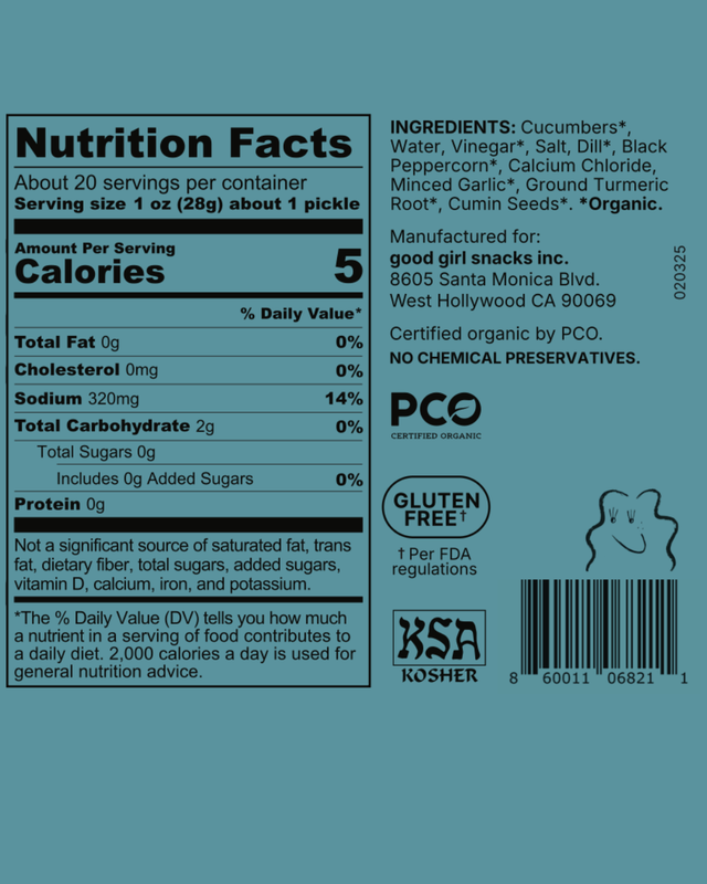 A classic dill pickle—elevated. Bright, tangy, and zesty with a twist of turmeric for that perfect savory bite.