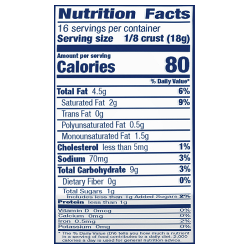Pillsbury Regular Frozen Pie Crusts bring a delicious taste and convenience to your kitchen! These crusts are ready to fill and can be used for one-crust or two-crust pies. No measuring or mixing - simply follow the instructions to go from freezer to oven. Perfect for gatherings and events, these baking must-haves are great for fruit pies, pecan and pumpkin pies, and savory dishes like a pot pie or quiche. Treat friends and family to something truly delicious with this easy pie dough crust. At Pillsbury, we strive to make home baked moments extra special through our products and recipes, which help make cooking and baking easy and convenient for even the busiest families. Contains Two pieces of Pillsbury Frozen Pie Crust, Regular, Two 9-Inch Pie Crusts and Pans, 10 oz.