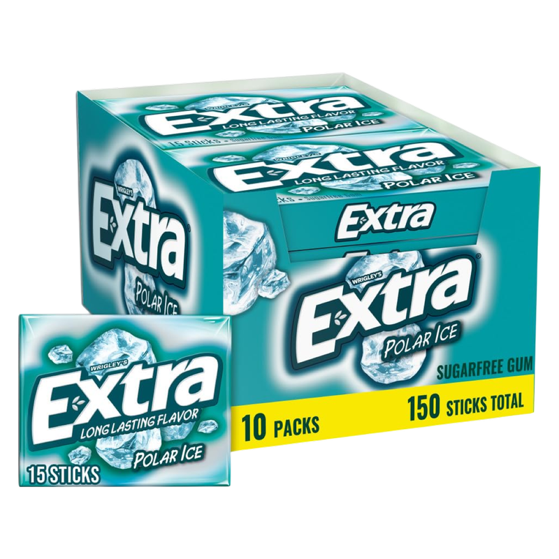 Discover a burst of refreshing flavor with EXTRA Polar Ice Sugar-Free Gum. Each pack of gum contains 15 sticks, and with a total of 10 gum packs in this set, it's great for stocking up at home or the office. Experience the exhilarating sensation of mint gum in each piece, offering an avalanche of icy freshness. Whether you need bulk gum for the family or candy dishes at work, this gum option is ideal. Enjoy the satisfying taste of mint gum bulk, embracing life's little connections with a piece of sweet mint gum. Share with friends and family, knowing that each moment of sharing gum can turn something ordinary into something extraordinary. When you choose gum in bulk, you're choosing more moments to give and get Extra. It's the ideal blend of flavor and convenience with each delightful piece of EXTRA Gum so you're always ready to give a little more. Unwrap a moment, with EXTRA.