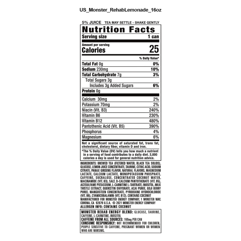 TEA + ENERGY | Monster Rehab Tea + Lemonade: RE-FRESH, RE-HYDRATE, RE-VIVE, or in other words, Re-habilitate with a killer mix of tea, lemonade, electrolytes, and our bad-ass Monster Rehab energy blend. Monster Rehab Tea + Lemonade delivers 160mg of Caffeine, and only 10 calories per can. REHAB THE BEAST | While chilling at the Rehab pool party in Vegas, admiring the flesh parade, and pondering the wisdom of doubling down when the dealer shows a face card, it hit me. We need a new drink, one that can do it all: a triple threat that quenches thirst, fires you up, and is the perfect choice after a hard day's night. STOCK UP WITH A 24 PACK | For those looking for a cool-brewed, non-carbonated energy drink, Monster Rehab Tea + Lemonade + Energy is available on Amazon in a convenient pack of 24. Due to new FDA nutrition labeling requirements, product labels may vary from those pictured.