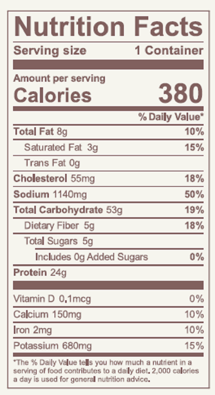 Microwave Directions 1) Remove meal tray from outer packaging 2) Pierce film, microwave on high 2.5-3 minutes 3) Let stand 1 minute before removing film 4) Peel film carefully and stir, meal will be hot