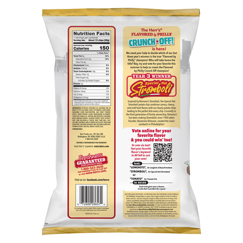 Inspired by Romano’s Stromboli, the Special Hot Stromboli potato chip combines savory, cheesy, and mild heat flavors with our hearty potato chips leading to the perfect bite every chip. Currently in the third generation of family ownership Romano’s has been making Strombolis since 1950 when founder, Nazzereno Romano, created the iconic sandwich in Philadelphia!
