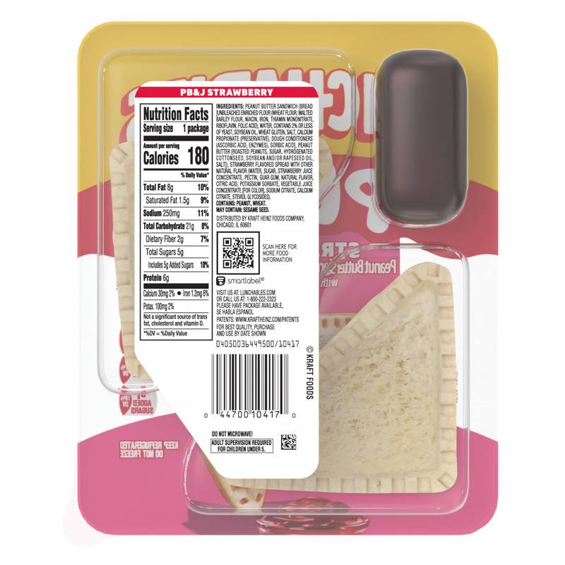 Kids' #1 favorite sandwich — now from Lunchables! Make snack time easy with Lunchables PB&J Peanut Butter Sandwich & Strawberry Flavored Dip. No wait needed, our snackable sandwiches are ready to dip and eat right out of the fridge anytime your kids are hungry. Each Lunchables PB&J snack kit includes two snack-sized crustless peanut butter sandwiches and strawberry flavored dip. With creamy peanut butter and a sweet strawberry flavored dip your kids will love, Lunchables PB&J allows kids to dip their sandwiches exactly the way they want. Each snack comes in a single-serve convenient package that offers portable eating. Ready when they are, Lunchables PB&J is a great snack for kids to enjoy at home or on the go. Always remember to keep your Lunchables PB&J refrigerated until you are ready to enjoy.