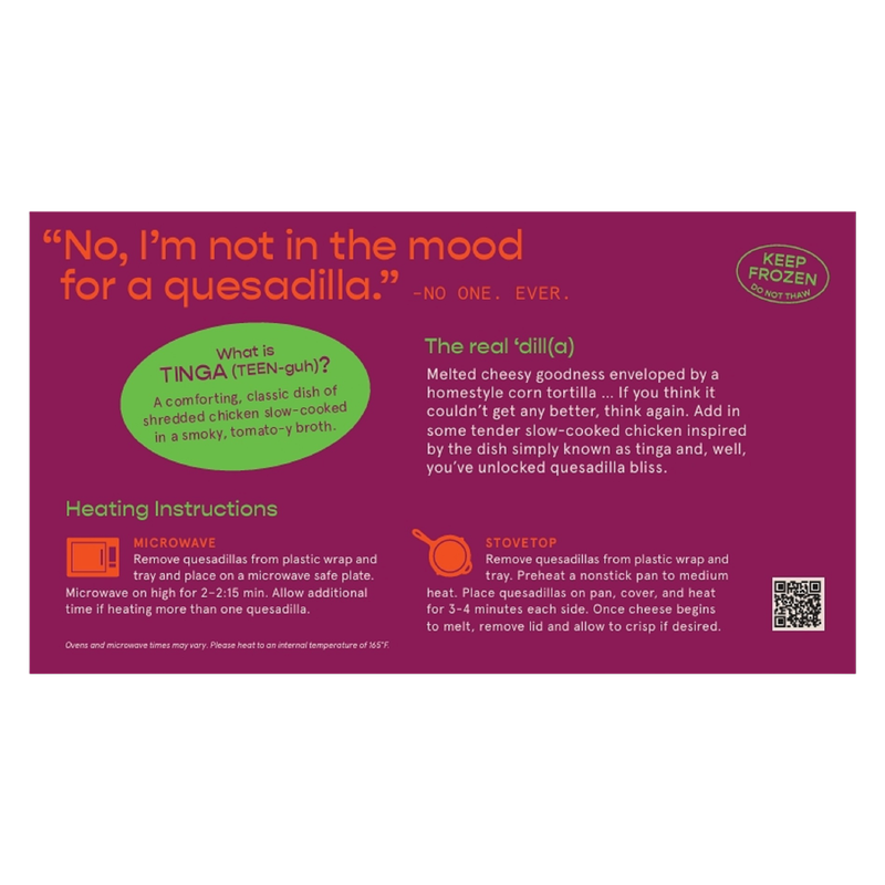 Stovetop: Remove quesadillas from plastic wrap and tray. Preheat a nonstick pan to medium heat. Place quesadillas on pan, cover, and heat for 3-4 minutes each side. Once cheese begins to melt, remove lid and allow to crisp if desired."