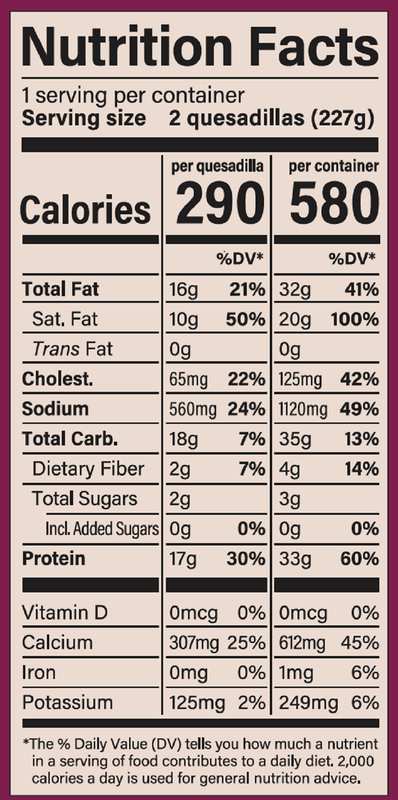 Stovetop: Remove quesadillas from plastic wrap and tray. Preheat a nonstick pan to medium heat. Place quesadillas on pan, cover, and heat for 3-4 minutes each side. Once cheese begins to melt, remove lid and allow to crisp if desired.