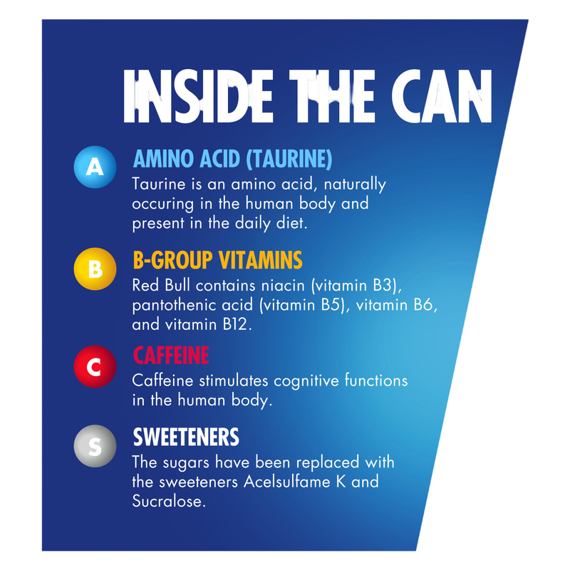 Red Bull Sugar Free Energy Drink gives you Wiiings whenever you need them. Red Bull Sugar Free is a lightly carbonated energy drink made with caffeine, taurine, B vitamins and water, that brings you the same taste and good times of Red Bull. Sweetened with acesulfame-potassium K and sucralose, Red Bull Sugar Free contains 20 calories per 12 fl oz can. While aiming for great heights during your workday, in your workouts or when gaming, why not crack open a refreshing can of Red Bull? This can of Red Bull will keep you ready for a road trip, watching the game and more. Red Bull gives you Wiiings. Always check can labels for most updated product nutritional and ingredient information. Calcium and sugars values declared on labels may vary slightly depending on production locations.