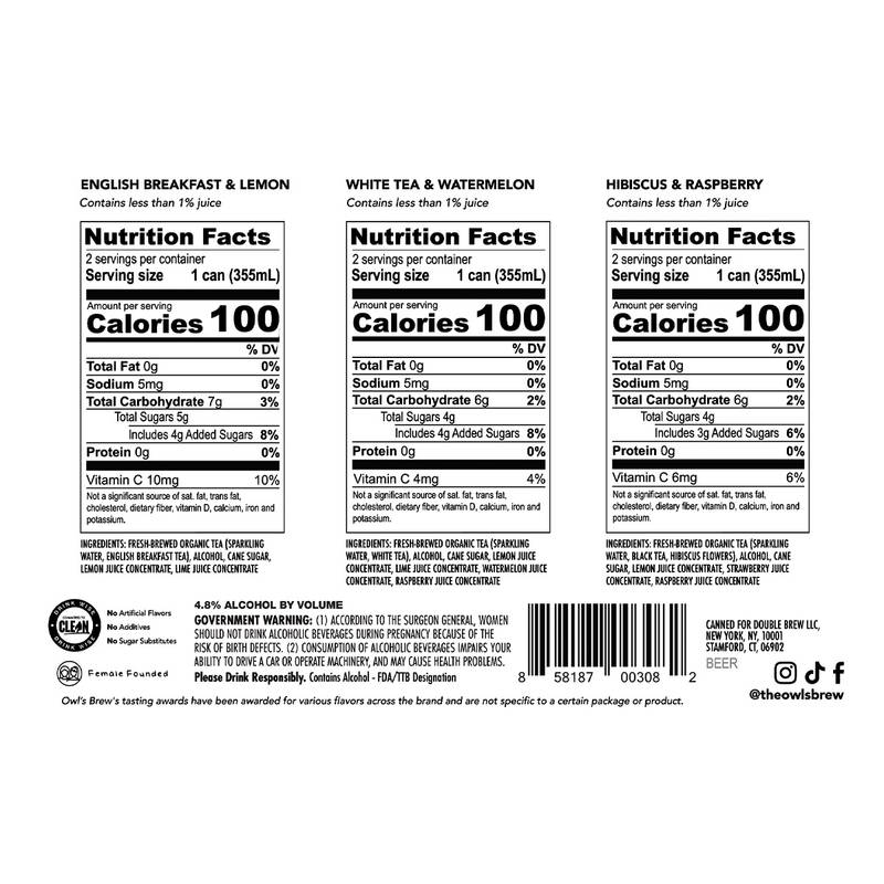 Owl’s Brew Boozy Tea is a clean, spiked sparkling tea made with fresh brewed tea & botanicals. Our ParTea Pack includes 2 cans of each of our flavors: English Breakfast Tea & Lemon, Darjeeling Tea & Hibiscus, White Tea & Watermelon.