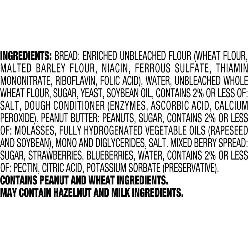 Make busy more doable with Smucker’s Uncrustables frozen crustless sandwiches — the easiest kid-approved snack and lunch food ever. Just grab one from the freezer and let it thaw. This box contains four individually wrapped sandwiches. Our limited-edition Berry Burst PB&J flavor is packed with creamy peanut butter and sweet mixed berry spread, made with a blend of strawberries and blueberries. The outside is Unbeatably Soft Bread Baked Fresh. Uncrustables sandwiches also contain no high fructose corn syrup and no artificial sweeteners or colors. Basically, they're super-convenient snacks and lunch foods that you can feel good about, and kiddos will happily eat. Pack ’em, snack ’em or have ’em with lunch on-the-go — with Smucker’s Uncrustables Peanut Butter & Mixed Berry Spread sandwiches, you’re in for a berry good time.
