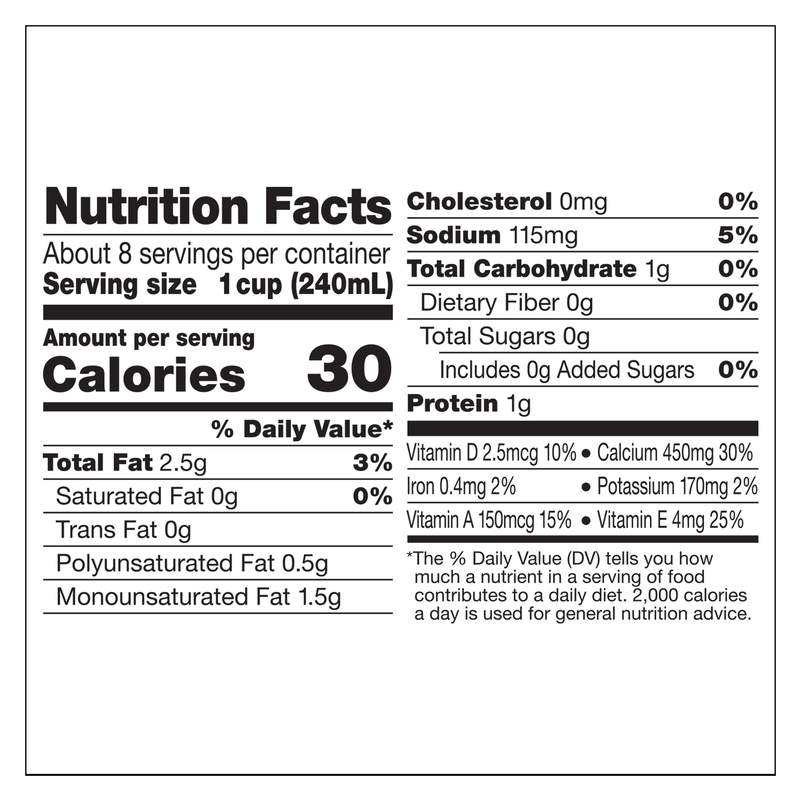 *See Nutrition Facts for sugar and calorie content. **Silk Unsweetened Almondmilk: 450mg of calcium per cup; reduced fat dairy milk: 293mg of calcium per cup. USDA National Nutrient Database for Standard Reference. Data consistent with typical reduced fat dairy milk.