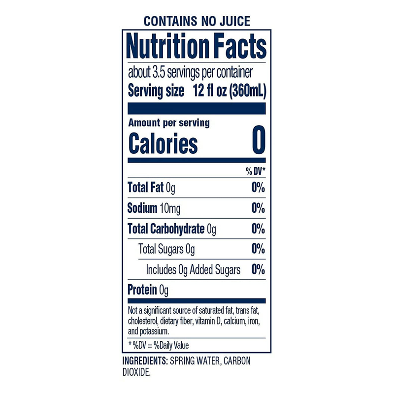 Pure and refreshing, containing NO sugar, artifical ingredients, additvies, or preservatives. Calorie free and very low in sodium. Great alternative to sugared soft drinks.