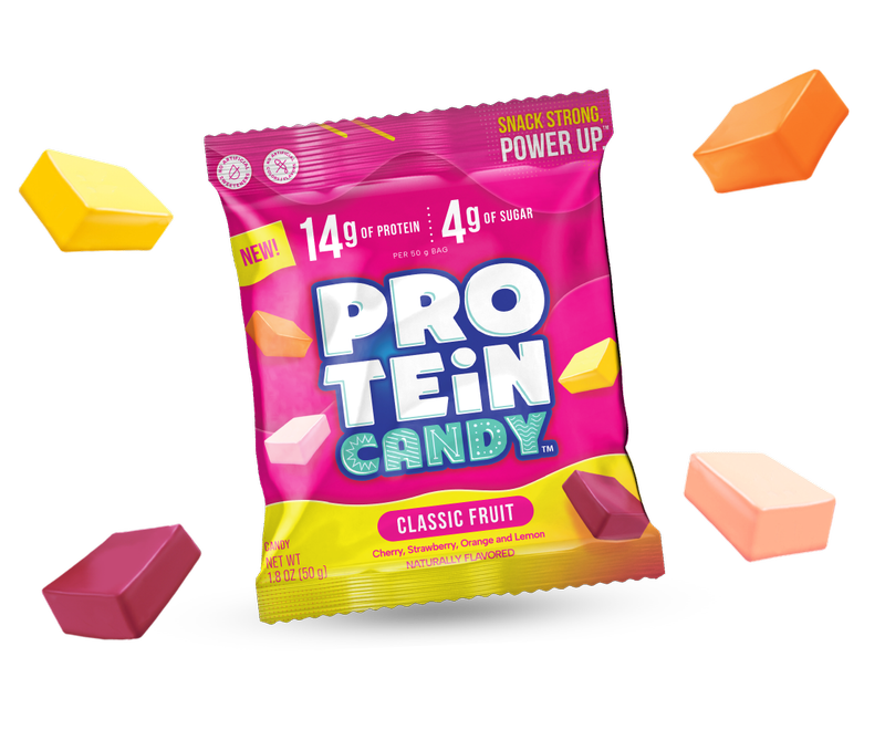 As classic as grandma's candies... but way better. Power up with chewy candies in Cherry, Strawberry, Orange, and Lemon flavors. With low sugar and high protein, you can satisfy your sweet tooth without the guilt. Perfect for snacking on the go!
