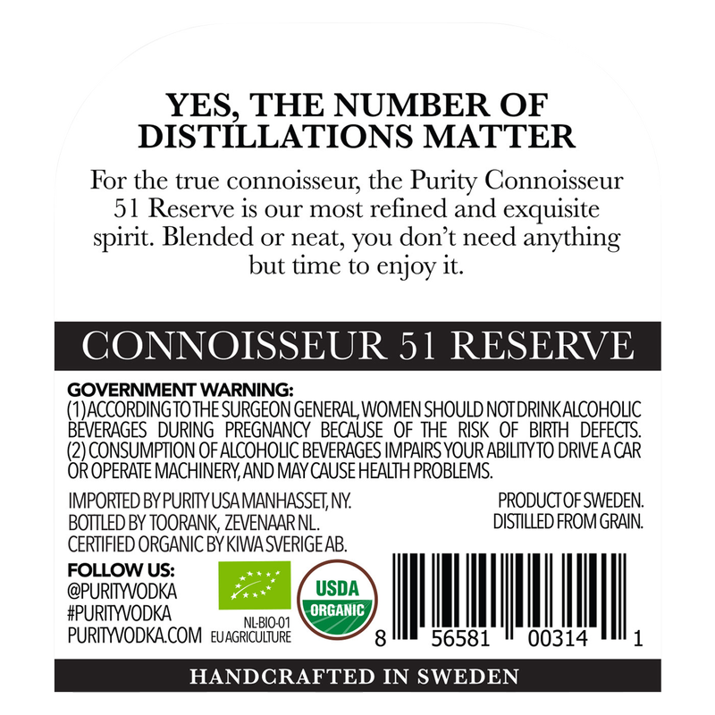 Our Purity Connoisseur 51 Reserve is an organic vodka of unparalleled smoothness & flavor. The combination of organic barley & winter wheat, slowly distilled 51 times over 20 hours on our custom-built copper still, is then blended with our unique soft water to create an unforgettably delicious vodka.