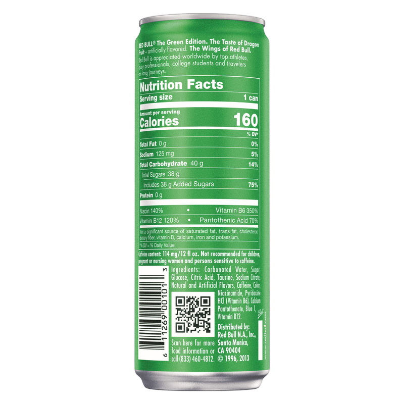 Red Bull Green Edition Dragon Fruit Energy Drink gives you Wiiings whenever you need them. Red Bull Green Edition is a lightly carbonated energy drink with a blend of caffeine, taurine, B vitamins, real sugar and water with the exotic taste of dragon fruit.* With 160 calories per 12 fl oz can, Red Bull is great for any occasion. While aiming for great heights during your workday, in your workouts or when gaming, why not crack open a refreshing can of Red Bull? Drink Red Bull straight from the can or enjoy in a glass over ice. This can of Red Bull will keep you ready for any occasion, whether it’s hanging with friends, watching the game or going on a road trip. Be ready for the big moments with a can of Red Bull. Store this can of Red Bull at room temperature or toss it in the fridge. Red Bull gives you Wiiings.