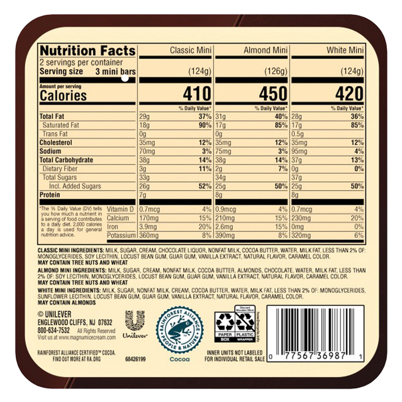 The Magnum ice cream Mini Variety is a collection of three of your favorite Magnum ice cream flavors â Magnum Classic, Mangum Almond and Magnum White Chocolate. Made with Belgian chocolate, each of these creamy and fragrant vanilla ice cream bars is dipped in a different decadent and rich chocolate coating.