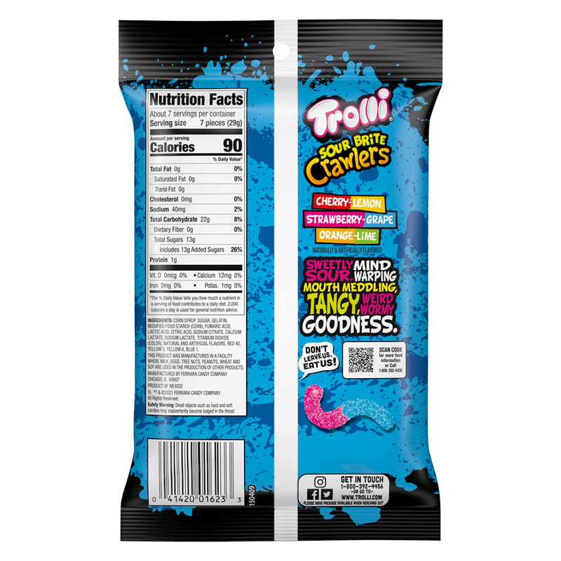 Trolli Sour Brite Crawlers are multi-flavored gummy worms covered in a tongue-twisting sugary goodness, striking the perfect balance of sweet and sour in every bite. The Original flavors include an assortment of combinations: Cherry-Lemon, Strawberry-Grape and Orange-Lime.