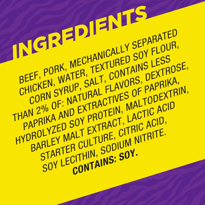 Experience intense, smoky flavor with delicious Slim Jim Original Savage Size Meat Stick. Made with beef, pork and chicken, these meat sticks contain no artificial flavors or colors for full meaty flavor everyone can love. Each meat stick serving is loaded with 6 grams of protein, ideal for protein snacks that kick hunger to the curb and leave you feeling satisfied. These individually wrapped snacks go where you go and are perfect as travel snacks, school snacks or anywhere meat snacks. Slim Jim Original Savage Size Meat Sticks offer a bold and tasty way to take on the day. Each snack stick is ideal for individual snacks on the go, so you are ready to hit back when savory cravings hit. Slim Jim keeps it interesting with a full line of beef sticks, snack sticks, pork rinds and jerky. Snap into a Slim JimĀ®!