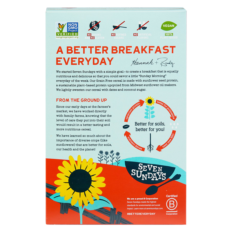 Meet the Better Boxed Cereal: Just 6 simple ingredients for a strong crunch, subtly sweet breakfast! This Grain Free Sunflower Cereal is made with sunflower seed protein, a sustainable plant-based protein up-cycled from Midwest sunflower oil makers. With a light dusting of organic cinnamon and coconut sugar before being toasted in coconut oil, this one is a modern twist on that classic cinnamon crunch. Oh yeah, and it's done without all that sugar. It's lightly sweetened with dates and coconut sugar! Seven Sundays creates the best possible breakfast experience that delivers amazing taste, maximum nutritional value and minimal environmental impact. That means sourcing plant-based, nutrient dense ingredients that are good for the health of soils, farmers, consumers and ultimately, our planet. Above all, Seven Sundays promises to be honest and transparent in everything they do.