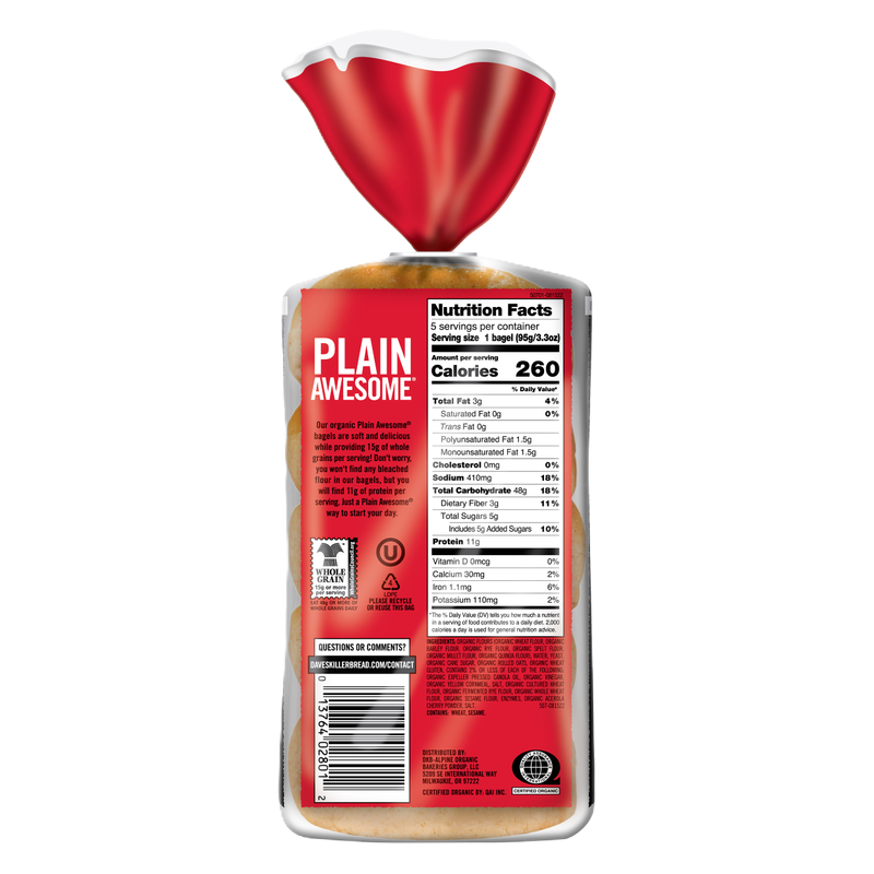 Dave's Killer Bread® Plain Awesome® Bagels are USDA organic and Non-GMO Project Verified, making them a plain awesome way to start your day.