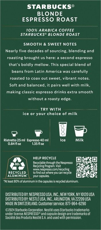 The same high-quality Starbucks coffee that you know and love is now made by Nespresso for you to enjoy at home. Plus, these capsules are made from aluminum for 100% recyclability and guaranteed coffee freshness. Nearly five decades of sourcing, blending and roasting brought us here: a second espresso that’s boldly mellow. Soft and balanced, it highlights milk’s sweeter side, making classic espresso drinks extra smooth without a roasty edge. Works with Nespresso Original Line machines, including: Essenza Mini, Pixie, CitiZ, Expert, Lattissima, KitchenAid, Creatista.