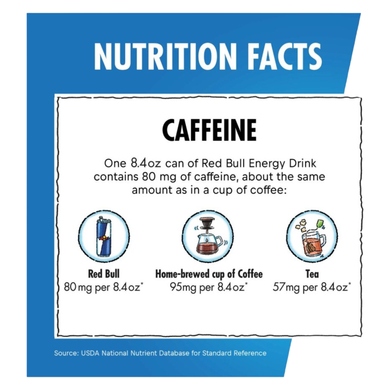 The sugar free version of the original energy drink that gives you wiiings, this lightly carbonated beverage is enjoyed worldwide by fitness enthusiasts, athletes, gamers, students and travelers. A refreshing can of Red Bull makes an excellent partner for busy, active lifestyles. Each 20 fl oz can contains 189mg of caffeine per serving and no sugar. It also includes Taurine, an amino acid naturally occurring in the human body, and B-group vitamins B6, B12, Niacin (B3) and Pantothenic Acid (B5). Available in 4-packs, 12-packs, 24-packs and Variety Packs. Comes in aluminum cans that can be recycled over and over. Always check can labels for the most updated product nutritional and ingredient information. Calcium and sugars values declared on labels may vary slightly depending on production locations. Always check can labels for most updated product nutritional and ingredient information. Calcium and sugars values declared on labels may vary slightly depending on production locations.