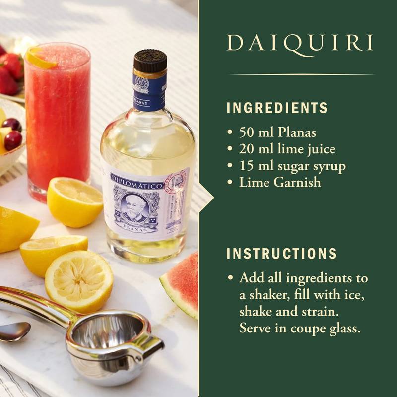 Diplomatico Planas Rum is an elegant aged white rum with a surprisingly fresh, smooth and complex taste that's ideal for elevating classic rum cocktails. Rich and complex, this white rum features fresh and tropical aromas, like ground coffee and coconut. Fruity flavors with a silky texture lead to a delicate and pronounced finish. Carefully crafted, Diplomatico Planas Rum is aged and then charcoal-filtered to get a clear color while retaining depth of flavor. Named after an area nestled at the foot of the Andes Mountains, it draws its smooth and complex flavor from this privileged land. Planas is a favorite among mixologists who want to elevate the complexity, quality, and flavor profile of their cocktails.