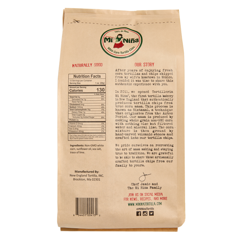 Tortilleria Mi Niña® is the first authentic tortilla bakery in New England that creates tortilla chips from 100% US NON-GMO white corn, lime, and water. The corn is cooked and volcanic stone ground daily by artisans to produce the masa (corn dough) we use to make our tortilla chips.