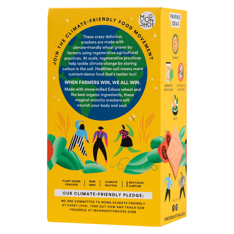 Tasty all on its own, yet strong enough to hold even your favorite sauces, nut butters, hummus, or spreads. MoonShot Crackers pair very well with cheese, meats or as a side for soups and salads.