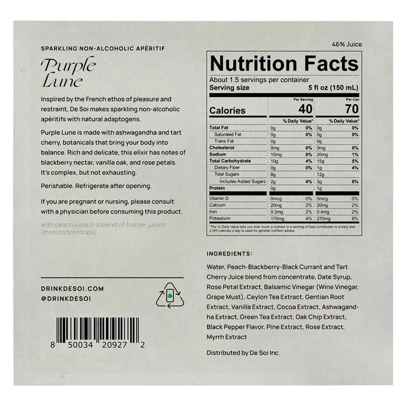 Purple Lune is made with ashwagandha and tart cherry, botanicals that bring your body into balance. Rich and delicate, this elixir has notes of blackberry nectar, vanilla oak, and rose petals. It’s complex, but not exhausting.