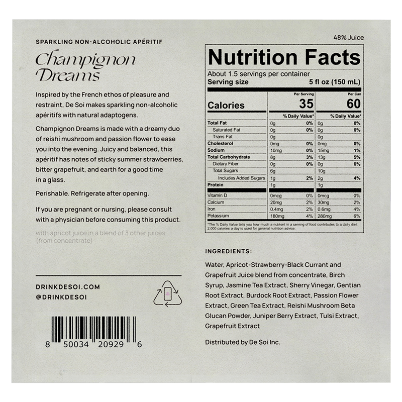 Champignon Dreams is made with a dreamy duo of reishi mushroom and passion flower to ease you into the evening. Juicy and balanced, this apéritif has notes of sticky summer strawberries, bitter grapefruit, and earth for a good time in a glass.