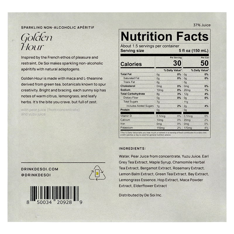Golden Hour is made with maca and L-theanine derived from green tea, botanicals known to spur creativity. Bright and bracing, each sunny sip has notes of warm citrus, lemongrass, and leafy herbs. It’s the bite you crave, but full of zest.