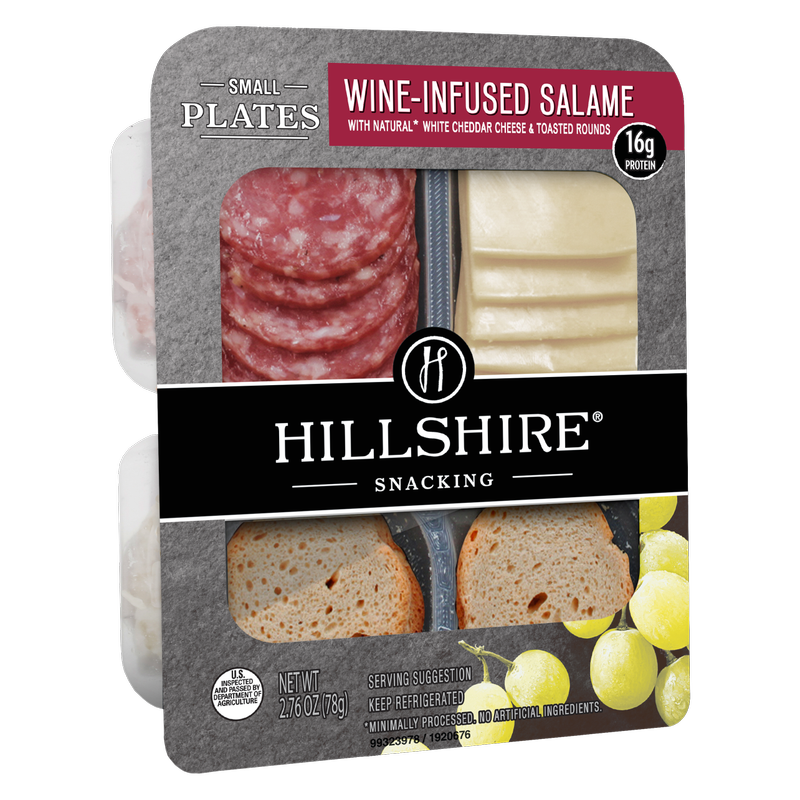 Wine-infused salame, natural white cheddar cheese, and crisp toasted rounds come together in Hillshire® Snacking Small Plates for a grown-up twist on snack time. Our Wine-Infused Salame Small Plate meat snack features chef-curated ingredients and flavors such as the spice of cured salame and rich notes of garlic for a truly elevated snacking experience. Try pairing with a fruity Sauvignon Blanc to further enhance the flavors of the savory salame and sharp white cheddar. Perfectly portioned for snacking on-the-go, our Wine-Infused Salame Small Plate has 16 grams of protein in each ready-to-eat serving. Includes one 2.76 ounce package. We’re big believers in a little thing called snack time. To us snacking is not about rushing or mindless eating. It’s about turning a few stolen moments into an elevated celebration that deserves to be savored. We’re here to turn snacking into an occasion, and you’re invited.