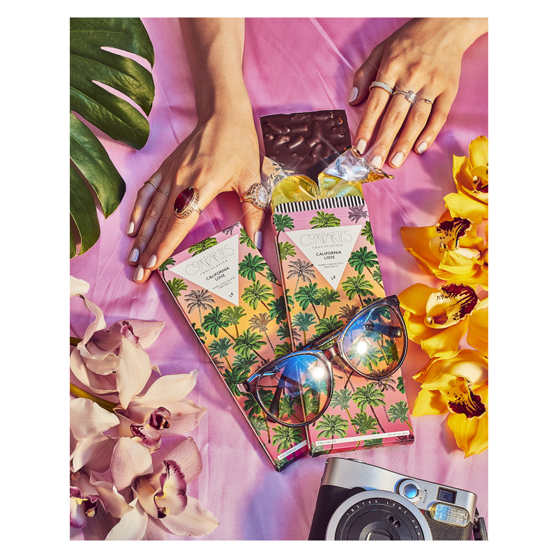 Gourmet handmade dark chocolate bar made with gourmet dark chocolate and tons of crushed San Francisco sourdough pretzels. This combo is the ultimate meeting of dark chocolate, sea salt, and crunch. We dare you to have just one bite of this delicious chocolate treat! Featuring Los Angeles palm trees with an LA sunset design, a gorgeous pink and green pattern adorns this handmade chocolate bar. Handmade in our Los Angeles chocolate kitchens.