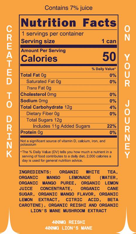 Iced Tea and Mango Lemonade brewed with functional, adaptogenic reishi and lion's mane mushrooms for uplifting energy, calm focus, mood boosting, and mental clarity. Made with all certified organic ingredients.