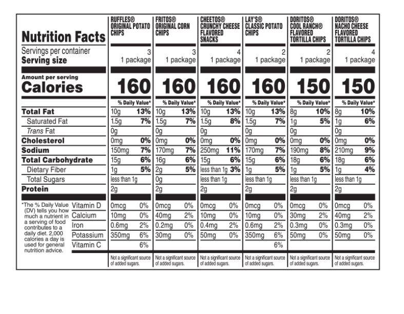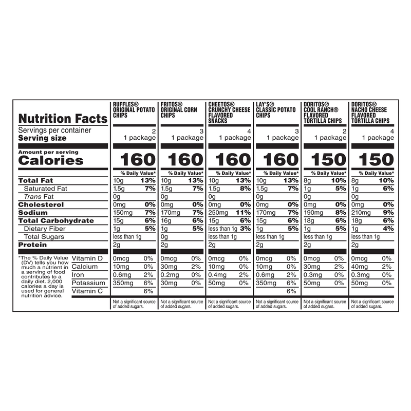 18 Count Frito-Lay Snacks Classic Mix Chips Variety Pack includes: Lay's Classic Potato Chips, Doritos Nacho Cheese Tortilla Chips, Doritos Cool Ranch Tortilla Chips, Cheetos Crunchy, Ruffles Original Potato Chips, and Fritos Original Corn Chips