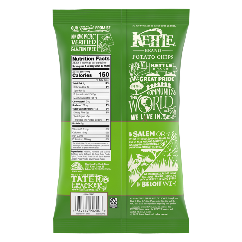 Give your taste buds fiery excitement with Kettle Brand Jalapeno Kettle Potato Chips. These kettle cooked jalapeno chips have a zesty, south-of-the-border flavor that strikes a perfect balance between real potato and the spiciness of jalapeno peppers. They’re easy to eat with a satisfying burn that sneaks up on you and makes your tongue tingle. Pair these hot and spicy chips with an ice-cold cerveza and then kick back with the festive, fiery flavor. Cut perfectly from whole potatoes, Kettle Brand jalapeno kettle chips deliver the delightful crunch you crave. All of our kettle cooked chips are Certified Gluten Free and Non-GMO. This 7.5-ounce bag contains about 8 servings and is perfect for stashing in your pantry so you can satisfy your craving for spicy snacks whenever it strikes. Enjoy these spicy hot chips on their own or as a side with sandwiches, burgers and more. When you open a bag of Kettle Brand chips, you know you're getting incredible kettle cooked potato chips made with authentic recipes by real people. In addition to Jalapeno, Kettle Brand gluten free chips are available in a wide range of flavors including Honey Dijon, Farmstead Ranch and Backyard Barbeque. No matter the recipe, every hearty bite of Kettle Brand chips is packed with irresistibly bold flavor.