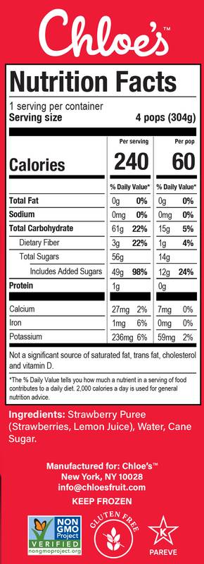Chloe’s Pops answer the desire for great taste and clean ingredients! Created by a Mom, Chloe's is made from just fruit, water and cane sugar. Chloe's 60 calorie Pops are Dairy Free, Gluten Free, Fat Free, Vegan, Kosher Pareve, Non-GMO Project Verified and free from all eight major food allergens.
