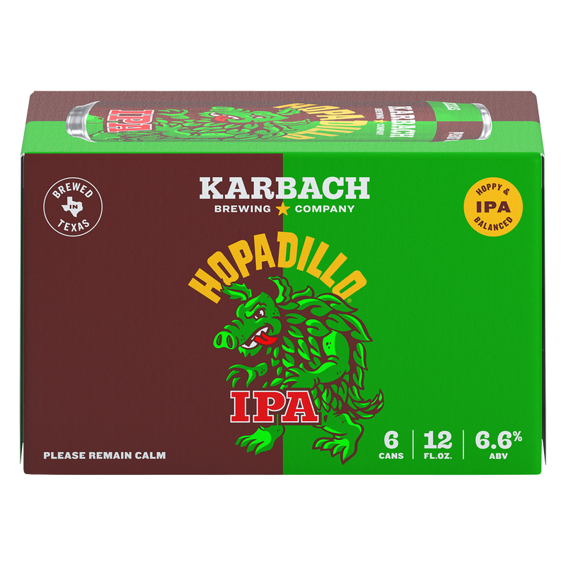 Karbach Brewing Company Hopadillo IPA is a dry-hopped, Texas India Pale Ale beer. This craft beer is bursting with bitterness of hops from around the world. This IPA beer has a 6.6% ABV and a 65 IBU rating. Hopadillo IPA beer is perfect for any occasion, such as catching the big game, grilling with friends or simply eating dinner. Pair it with Thai cuisine, red curry, bleu cheese, grilled steak for the perfect match. This India Pale Ale six pack of beer comes packaged in beer cans for easy storage and portability.