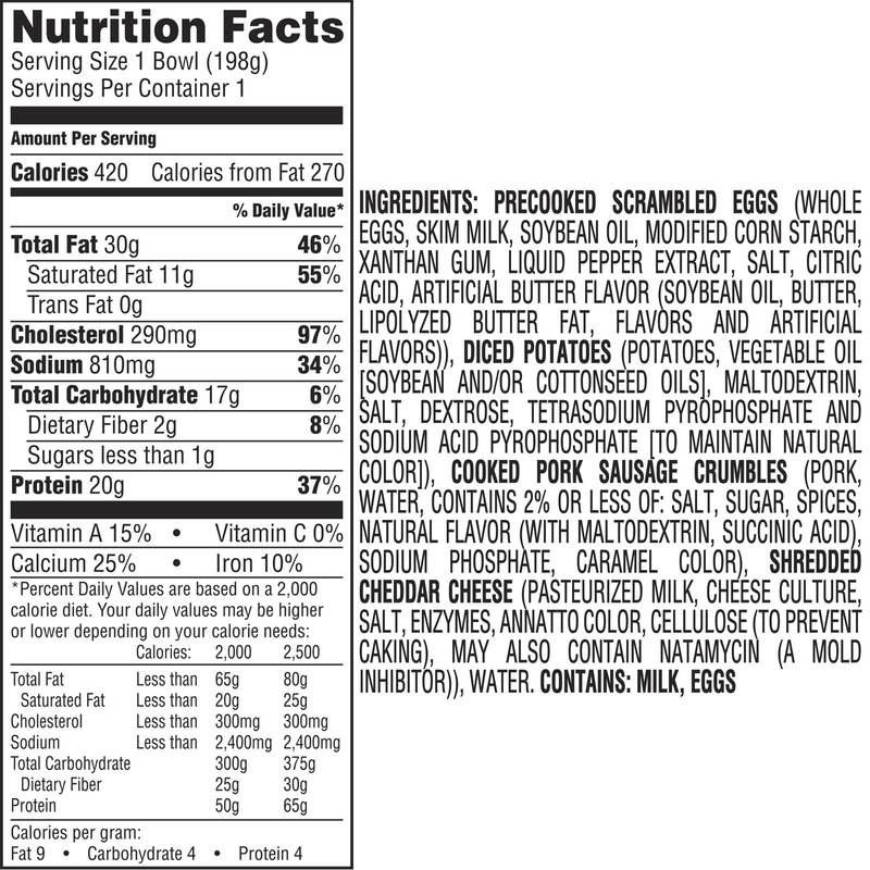 Filled with sausage crumbles, eggs, potatoes, and cheddar cheese, Jimmy Dean Sausage, Egg & Cheese Breakfast Bowls are sure to be the best part of your morning. Each microwavable bowl has 19 grams of protein per serving. Simple to prepare as a microwavable breakfast and ready in minutes, our frozen breakfast bowl is made with premium ingredients and the Jimmy Dean brand quality you know and trust., Rise and Shine: Start your morning off with a boost of happiness so good, you can taste it.